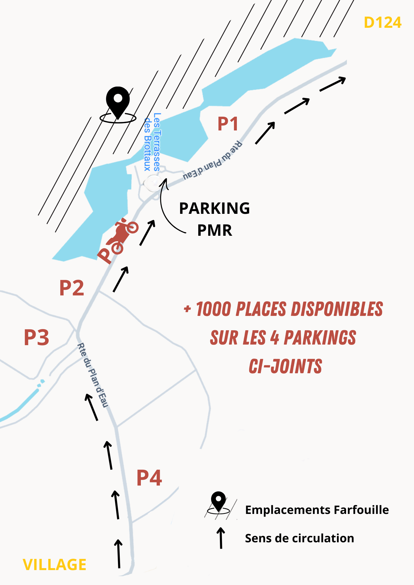 L’entrée sur le site du plan d’eau pour accéder à la Farfouille et aux parkings ce fera par le village de Blyes et la sortie par la nationale. Pour des raisons d’accessibilité, merci de stationner exclusivement sur les parkings prévus à cet effet. Aucun stationnement sur les bas côtés ne sera toléré !